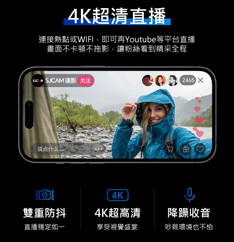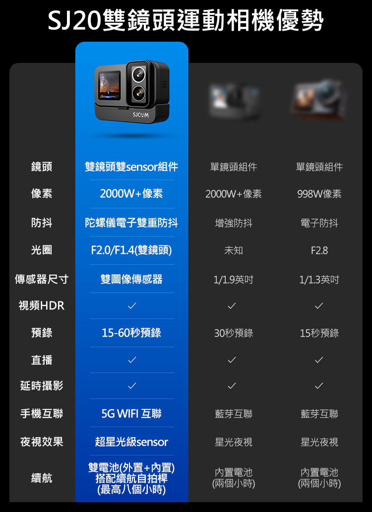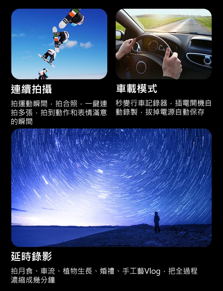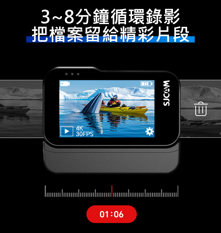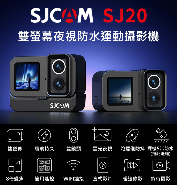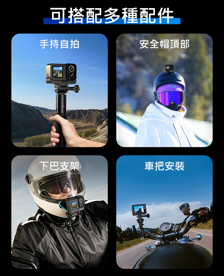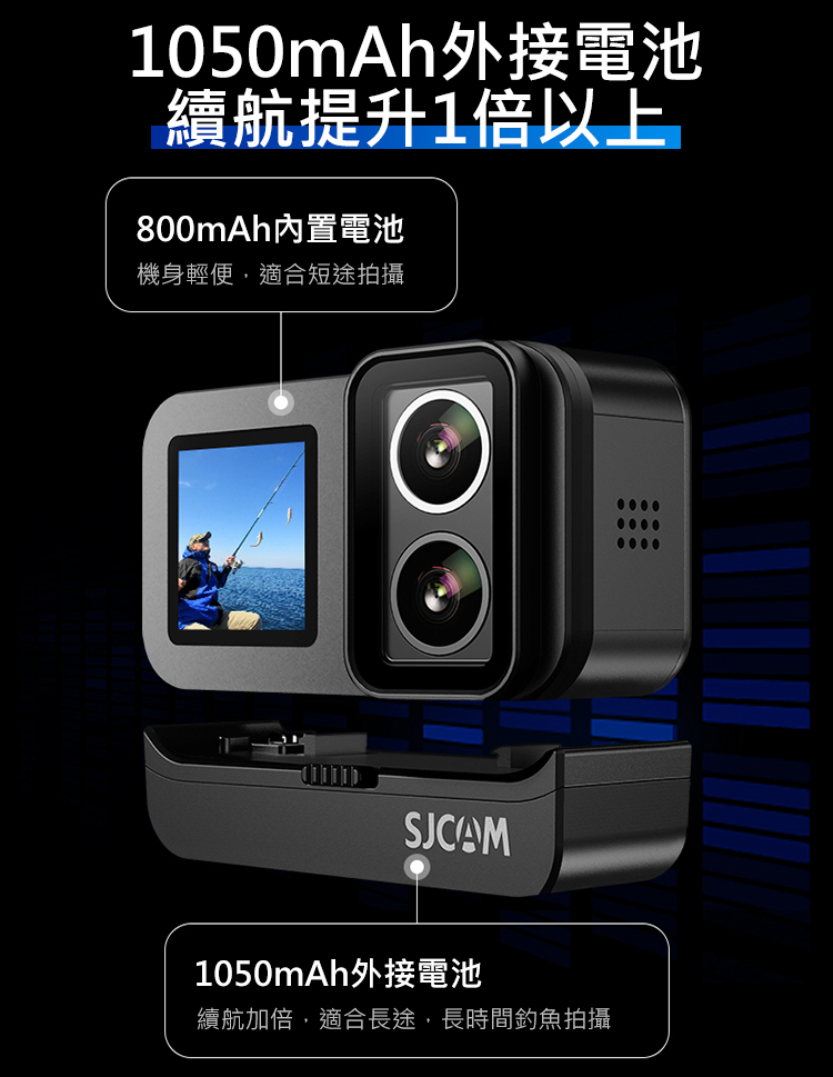(續航版)主機×1、續航自拍桿x1、鎖緊螺絲x1、電池x1、防水殼×1、邊框支架×2、頭盔底座x2、轉接頭x2、底座x2、鎖緊螺絲x2、3M黏貼膠×2、降噪海綿x8、USB數據線×1、SJCAM貼紙×1、擦拭布×1、說明書×1