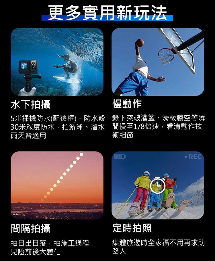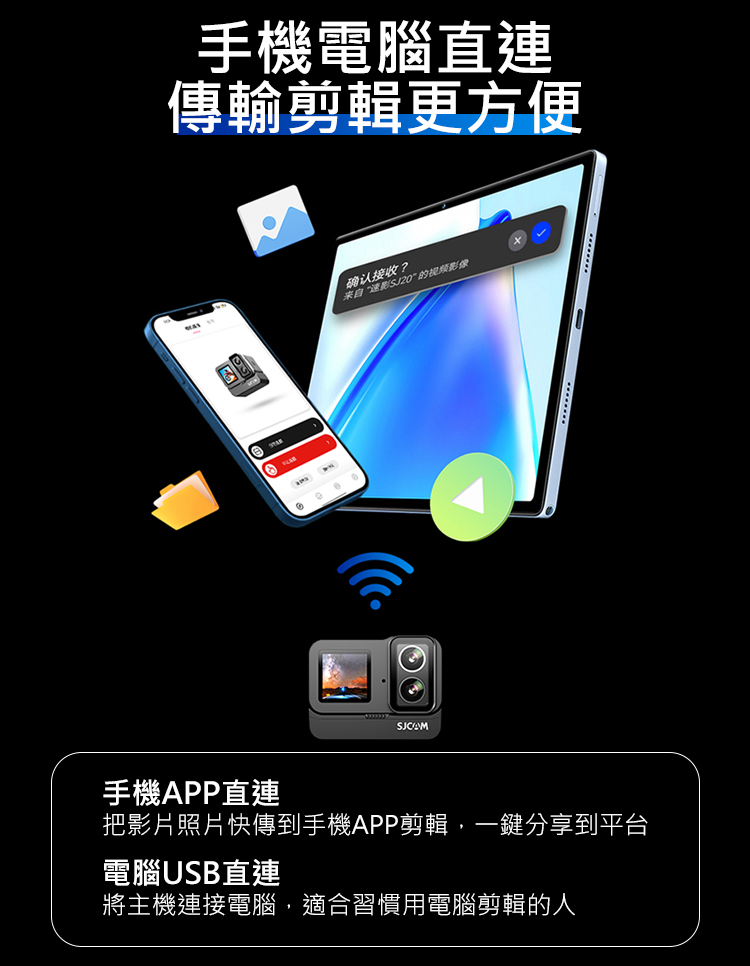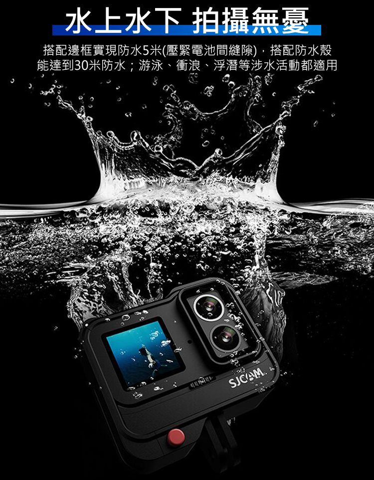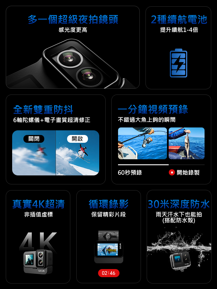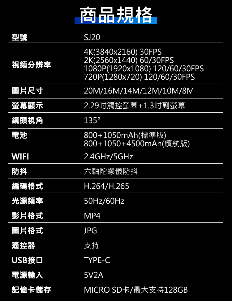 (標準版)主機×1、電池x1、防水殼×1、邊框支架×2、頭盔底座x2、轉接頭x2、底座x2、鎖緊螺絲x2、3M黏貼膠×2、降噪海綿x8、USB數據線×1、SJCAM貼紙×1、擦拭布×1、說明書×1