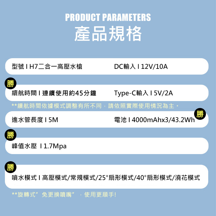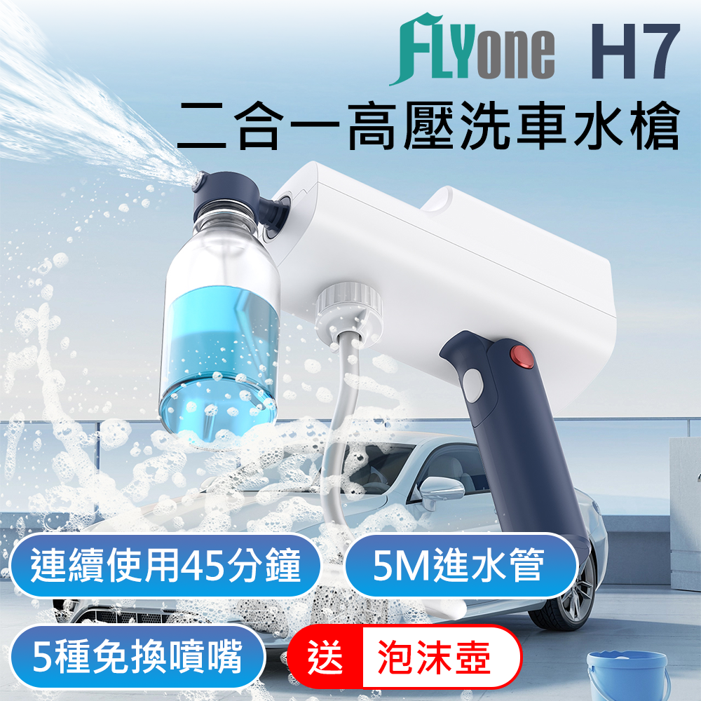 .商品內容: H7高壓水槍X1、進水管X1、可調噴嘴X1、充電線X1、DC12V車充X1、密封圈X1、說明書X1